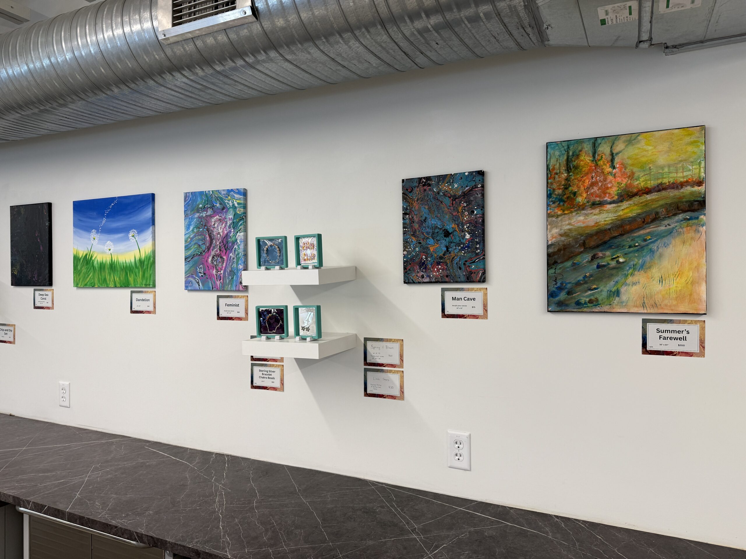 The conference room doubles as an intimate gallery space, featuring rotating artwork that adds character and visual interest to a quiet, private setting. Suited for small gatherings, meetings, or workshops, the space offers a professional atmosphere within a creative environment.