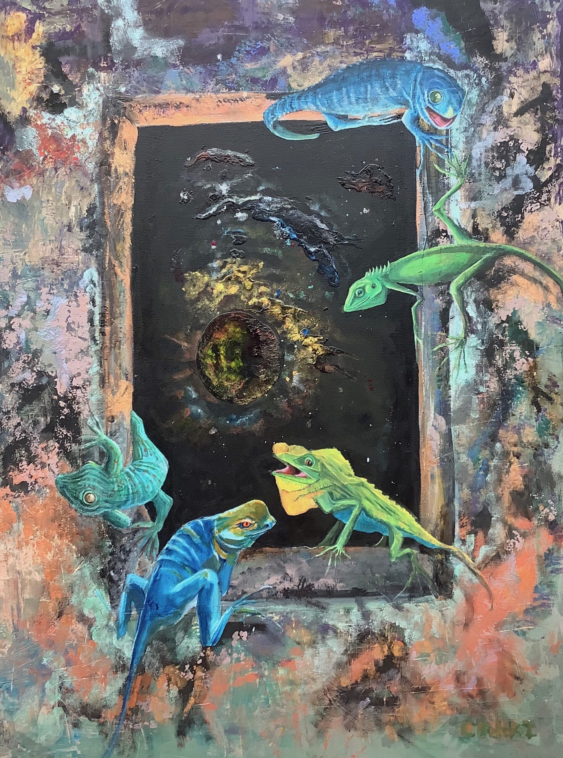 My primary medium is acrylic though I experiment with oil, pastel, watercolor, pencil and collage, sometimes combining two or more in a work. I love texture and frequently add multiple layers of thick paint or fiber paste to create dimension and interest.