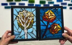 Experiment with color and composition in this Abstract Stained Glass Art Bar. Using a variety of glass shapes and vibrant hues, you’ll design a dynamic square piece that highlights contrast, balance, and movement.