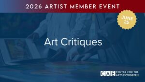 Bring your work and gain valuable insight! In this exclusive workshop for CAE artist members, participants are invited to share a piece of their artwork and receive constructive critique from a local art professional, whether an experienced artist, gallery owner, or art consultant.