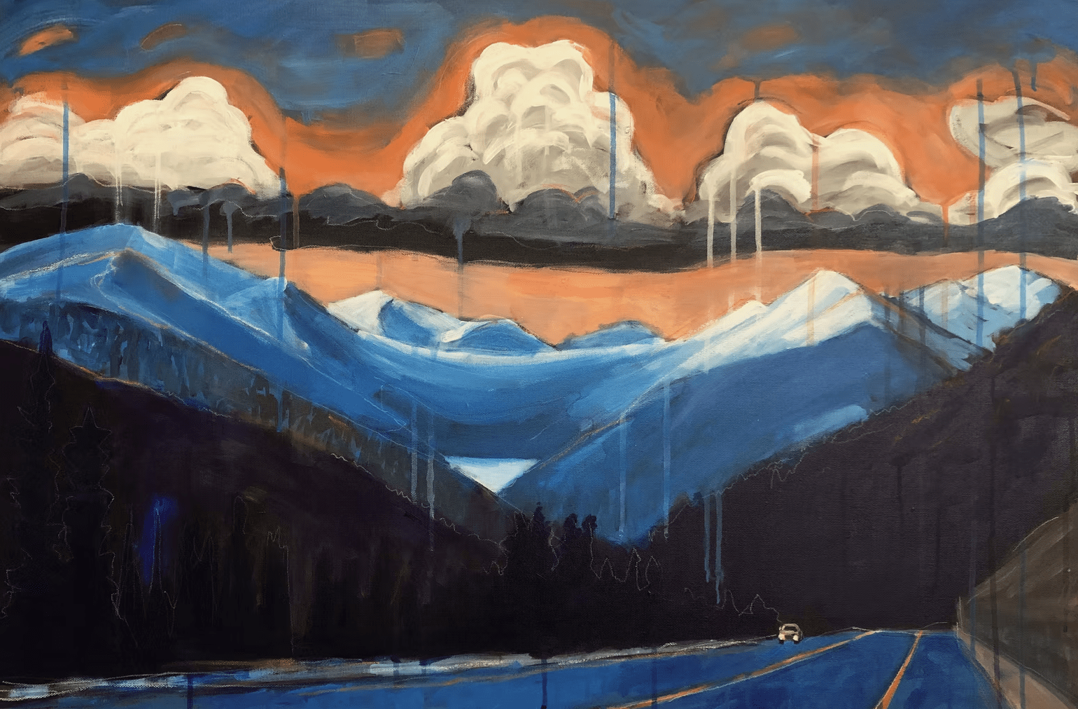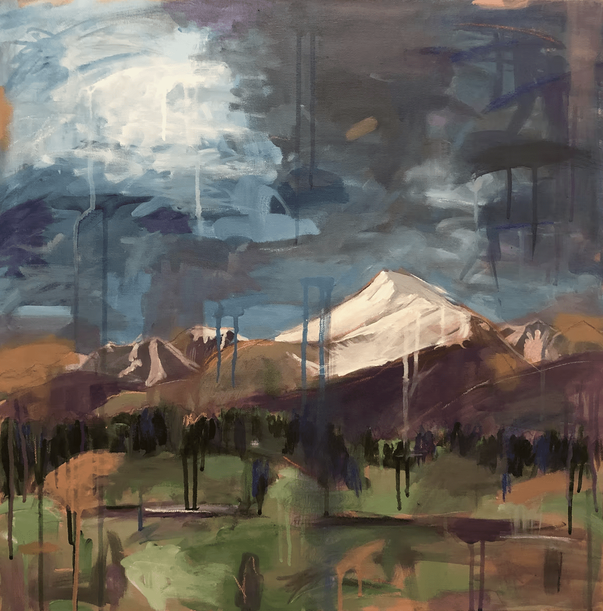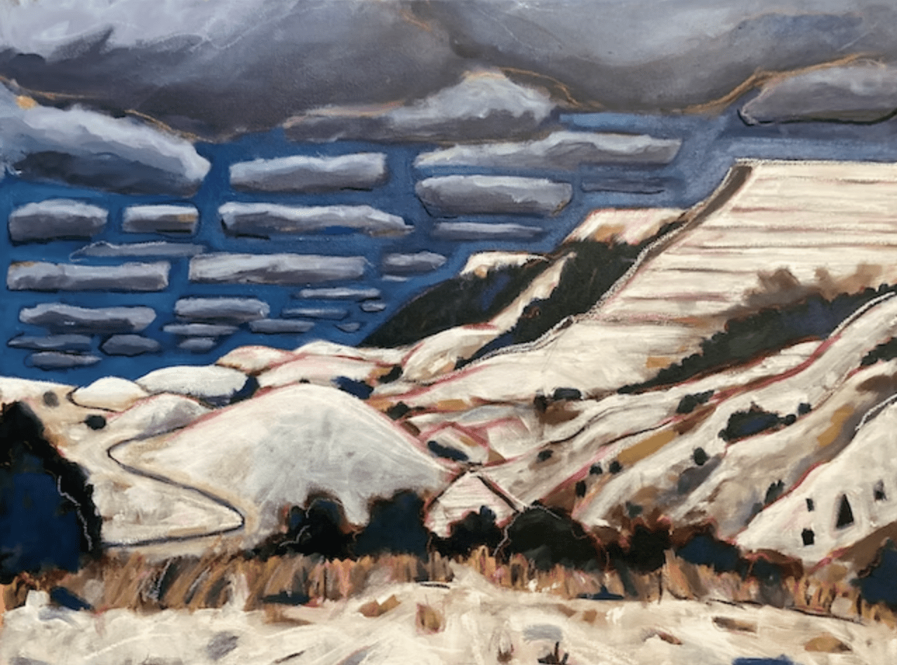 I have been painting for nearly three decades, exploring process and outcome, meaning and metaphor. For several years, my work has explored the romantic landscapes of Colorado and the West with a personal, visionary approach. These paintings are mysterious and a bit surrealistic, like settings for a fairytale, or a half-remembered dream. The skies may hold fanciful shapes, and the colors are sometimes unexpected. A direct, bold painting technique and the use of expressive mark-making in a variety of media create energy and movement across the canvas. These are lively, complex and entertaining works.